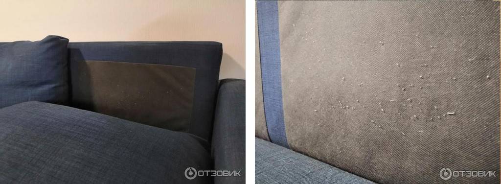 На скрытой за подушками части образуются катышки, Тут сэкономили на материале. Но это болезнь всех дешевых диванов ИКЕА. Те части. которые не видны глазу, отделывают вот таким хлипким материалом, который очень легко рвется.