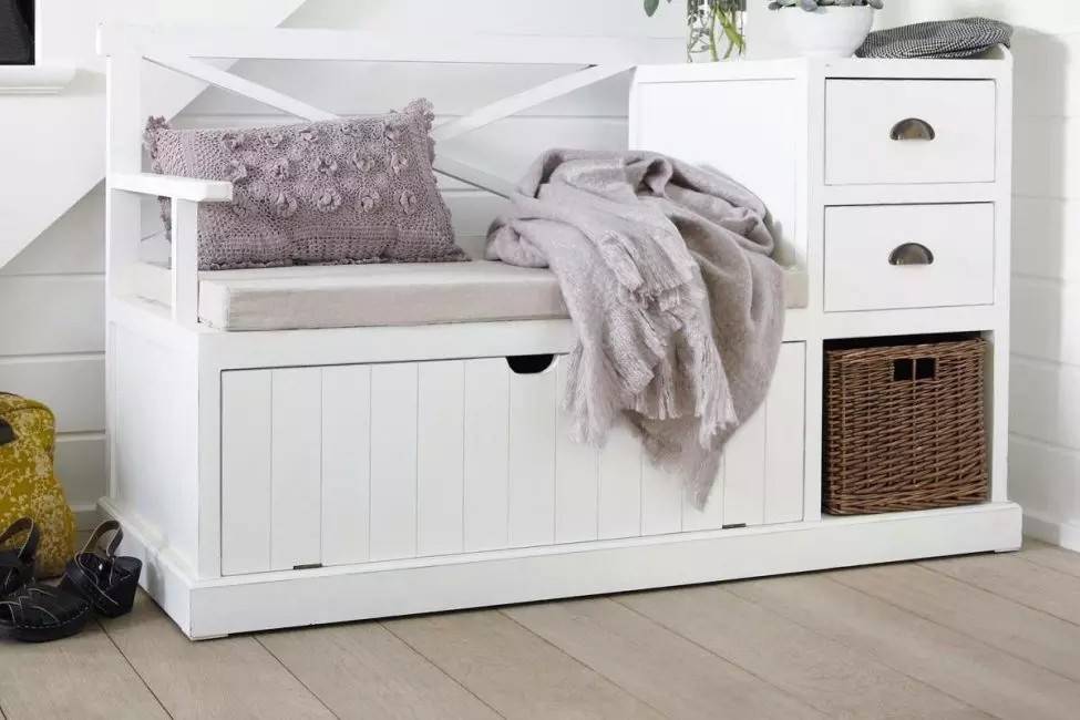 - Стильный дизайн в духе скандинавского максимализма, поможет вписать скамью с ящиком практически в любой интерьер.