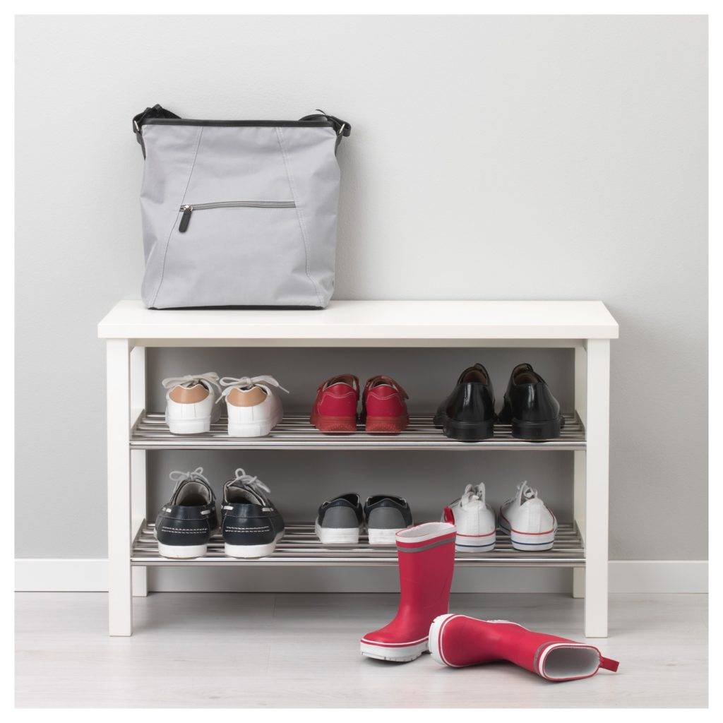- Две полки под скамьей вмещают 8-10 пар обуви. Достаточно для семьи их трех человек;