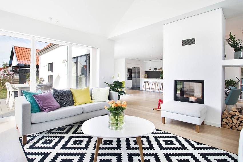 В интерьере дома в скандинавском стиле используется открытая планировка при оформлении большинства помещений