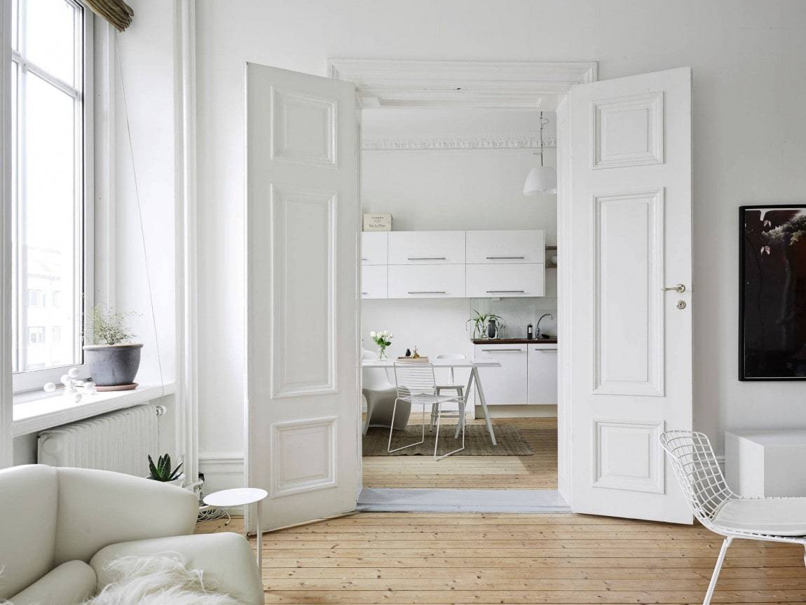 На фото сочетание белого дверного полотна с деревянным полом в кухне и гостиной.