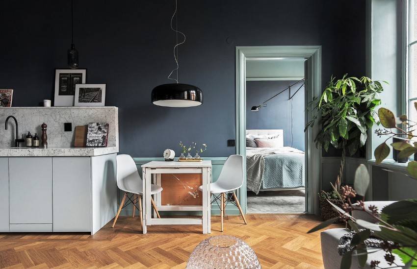 В очень маленькой квартире-студии или однокомнатном жилище стиль скандинавов придётся как нельзя кстати. За счёт того, что используется много белого цвета в отделке стен и потолка, даже пола, квартира кажется намного больше. Мебель здесь присутствует в минимальном количестве, зато она многофункциональная. Диван здесь может использоваться и как полноценное спальное место, обеденный стол трансформируется в рабочее место. Шкаф-купе не займёт много места.