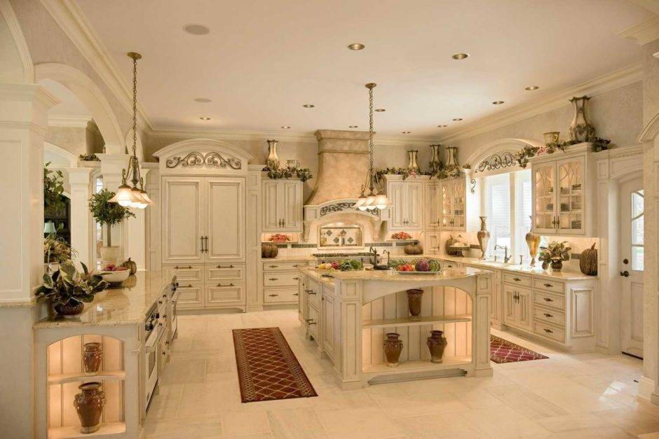 Детали интерьера не вычурны, цветовая гамма в светлых тонах. Мебель выполняется в пастельных оттенках с дополнением золотистых деталей. Рококо предпочтительно использовать в просторных кухнях, потолки могут быть украшены сложной конструкцией.