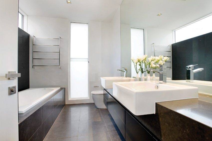 Белые стены ванной комнаты в сочетании с темной плиткой и мебелью