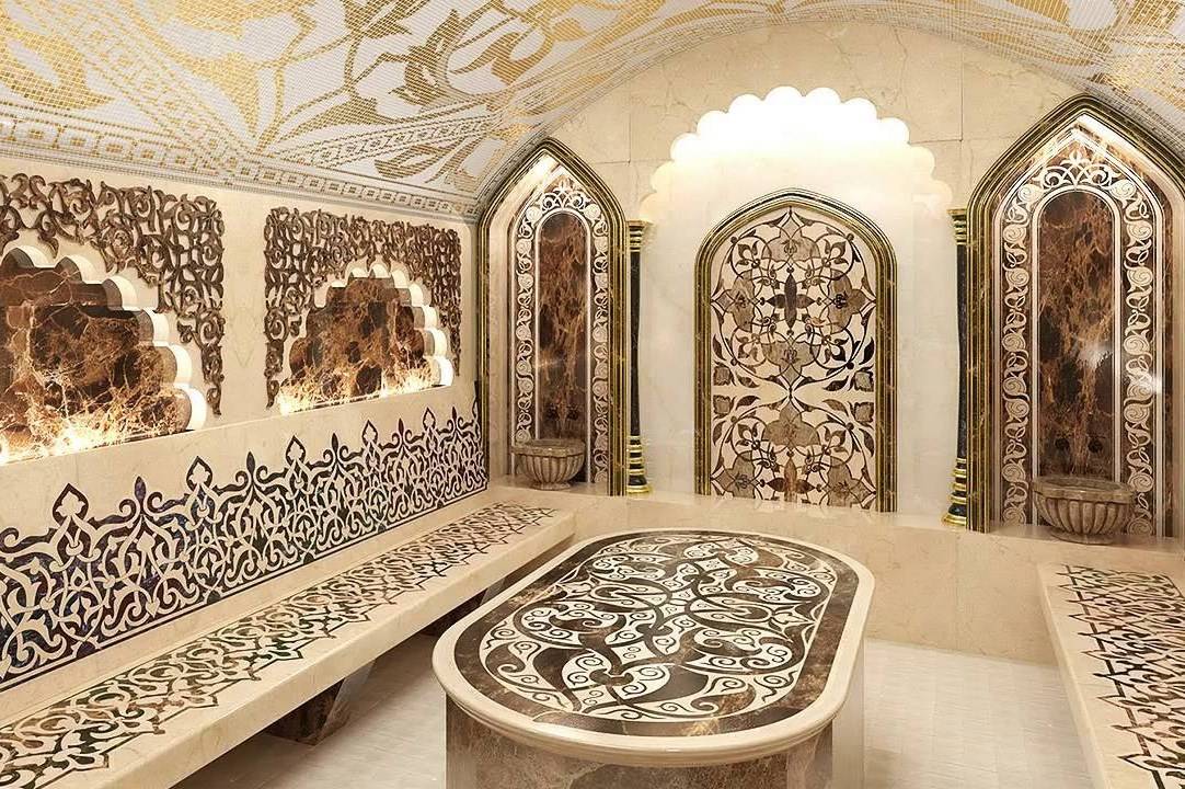 Все внутренние помещения турецкой бани, за исключением хозяйственных комнат, изобилуют фантазийными орнаментами на стенах, полу и даже потолке. Для облицовки можно использовать готовую плитку с нанесенными узорами или выложить красивые картины разноцветной мозаикой. Распространена смешанная техника, когда интерьер турецкой бани создается одновременно с помощью плитки и мозаики. Например, стены и пол могут быть украшены плиткой, а сводчатый потолок гораздо удобнее украсить мозаикой.