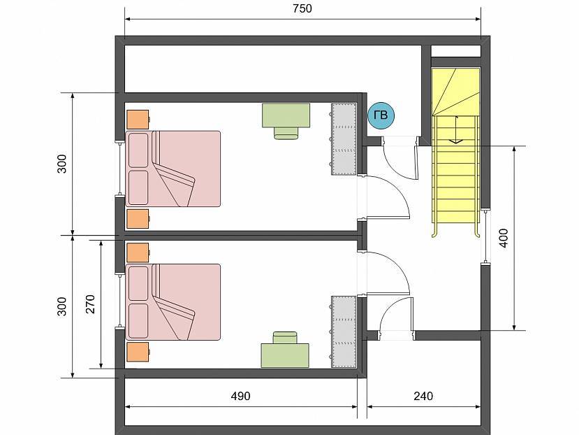 В доме с обустройством дополнительного этажа в чердачном помещении можно сделать две спальни на первом этаже и санузел. Лестница в таких сооружениях чаще всего обустраивается именно в прихожей или холле.