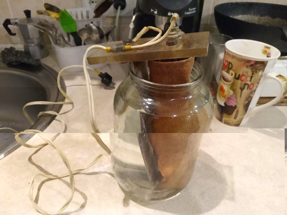Из куска ткани, которая не пропускает жидкость, делают небольшой мешок и кладут в банку. Он должен быть плотно закреплен. Провода лучше брать из нержавеющей стали. Первый помещают в банку, второй – в мешок. Закрепить электроды можно при помощи капроновой крышки. Противоположные концы запитывают от электрической сети, после чего наливают воду и включают прибор.