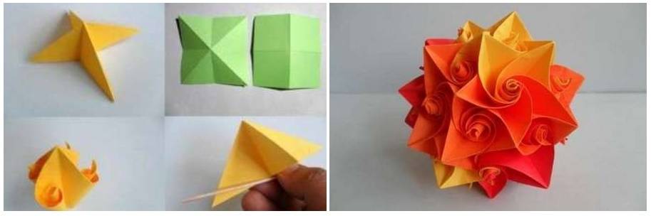 - Следующим этапом будет сбор цветка: для этого необходимо сложить основу до величины одной части, скрутить в трубочку и через пару секунд расправить, при этом не сильно раскрывая углы.