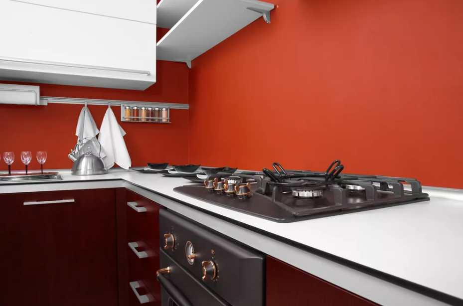 - Что предпочтительнее для красной, желтой или оранжевой кухни? Здесь следует использовать спокойный нейтральный цвет на стене. Для создания контраста стена делается полностью белой или черной. Но стоит учесть особенности общей конструкции.