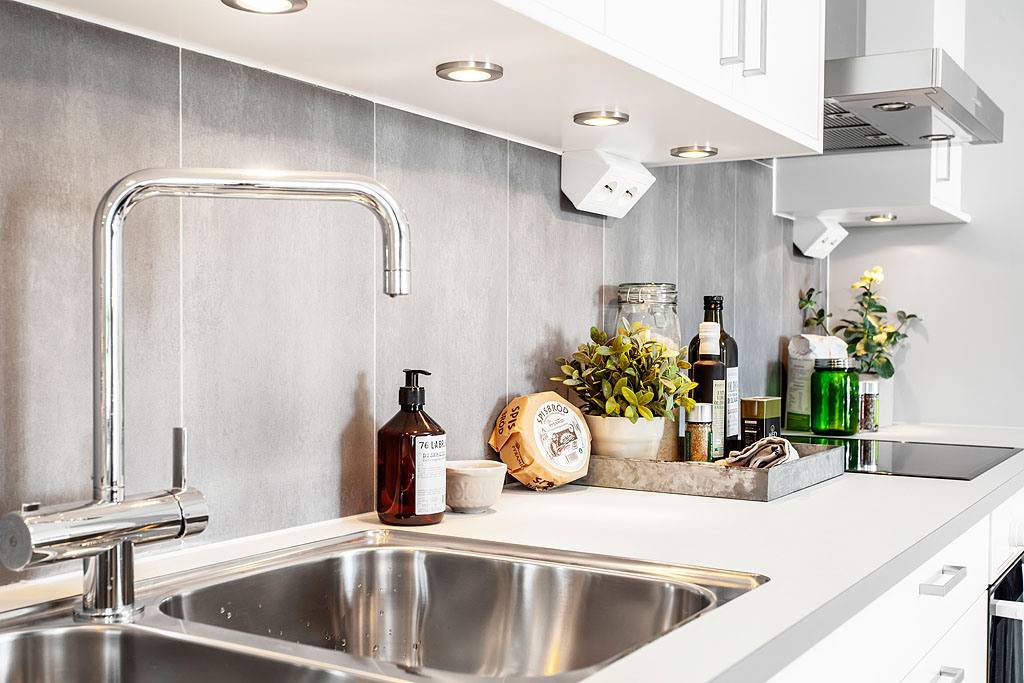 Металлический фартук прочен, не подвержен никаким агрессивным воздействиям, но имеет всего две фактуры — глянцевую и матовую. Он идеально подходит для кухонь в стиле минимализма или хай-тек. К сожалению, в других стилях он будет смотреться не совсем уместно.