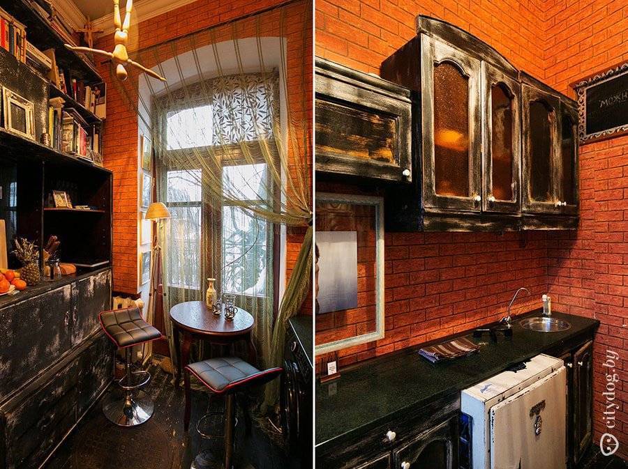- Для коричневого гарнитура подойдет глянцевое покрытие светлого тона или кирпичный стиль.