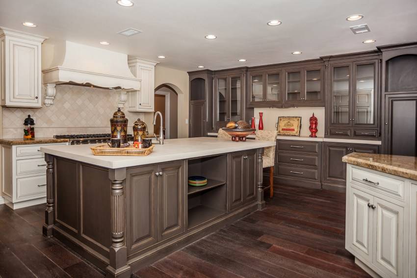 В загородных домах достаточно часто можно на кухне увидеть камин с лепниной, сервант, буфет с расставленной посудой – все это только подчеркивает классические акценты.
