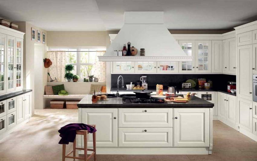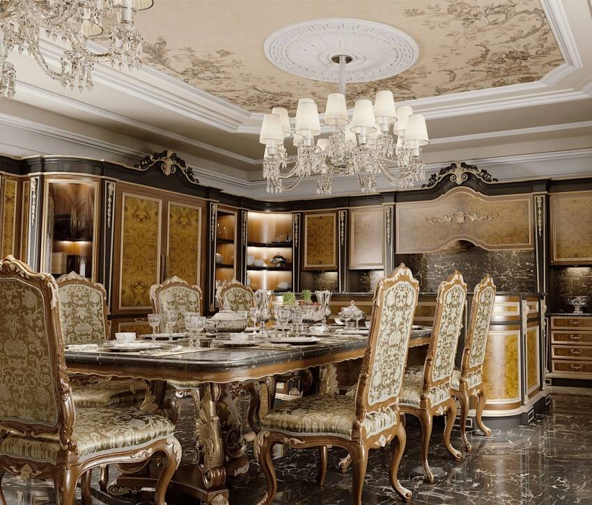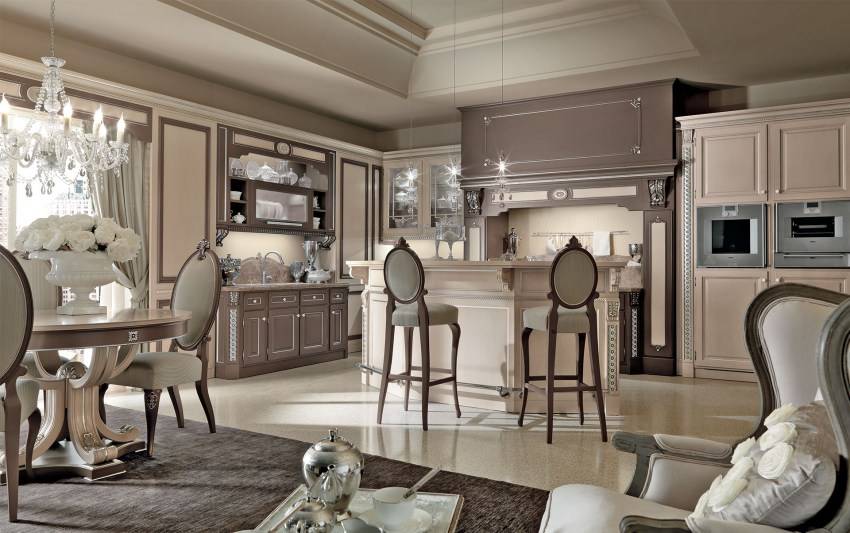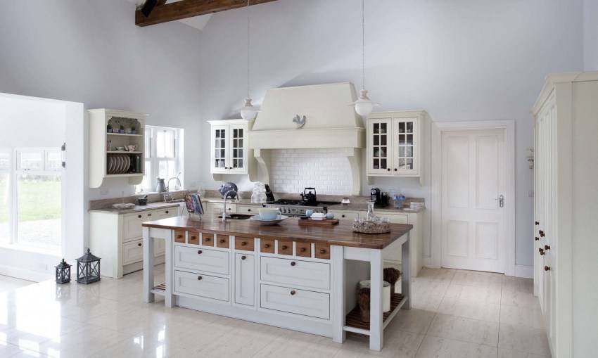 Помещение будет вместительным и светлым. Основной формат – поделить на комнату на две зоны: рабочую, где происходит готовка, и столовую. Столешница изготавливается из камня или дерева. Она вмещает печь или мойку. Само помещение обставлено мебелью с закругленной спинкой, посудой из фарфора и стеклянными витринами.