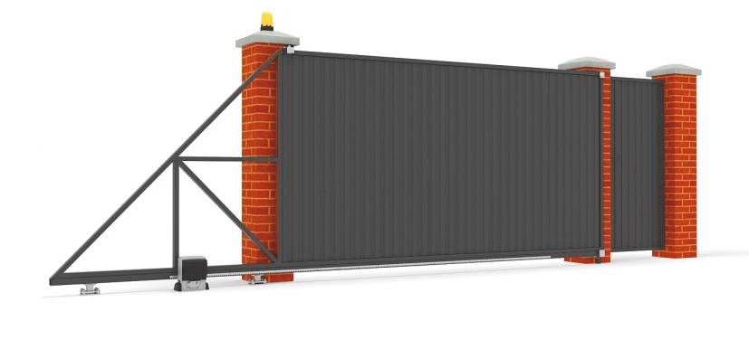 Эта конструкция хороша тем, что над проездом нет балок. Но она — самая дорогая в устройстве. Дело не столько в системе роликов, сколько в необходимости устройства фундамента с металлическими закладными, к которым затем будет крепиться консольная балка. Если столбы уже есть, фундамент заливается перед ним и вдоль забора на длину технического выноса, который необходим для компенсации нагрузки, создаваемой полотном.