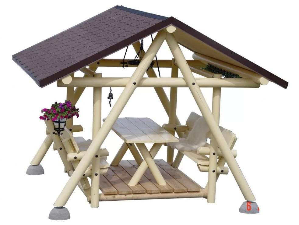 Вариант для отдыха большой компании довольно сложен в изготовлении. Качели состоят прочного каркаса с навесом, 2 скамеек, столика и подвижной платформы. Благодаря шарнирным креплениям раскачать конструкцию может даже ребенок.