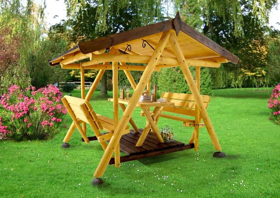 Стандартным местом установки качелей остаются детские площадки и зоны отдыха взрослых. Если вы собираетесь смастерить качели для дачи своими руками из дерева, неплохо было бы расположить их на террасе. Крыша постройки станет надежной защитой от неблагоприятных природных воздействий и поспособствует продолжительной эксплуатации релаксационного аксессуара. С размером вы разогнаться сильно не сможете, но для стандартного варианта на двоих, в беседке место всегда отыщется.
