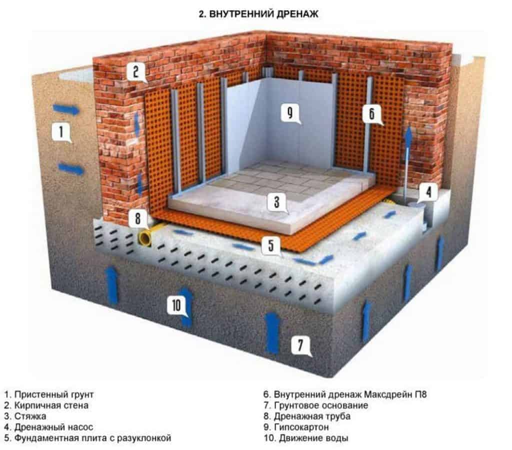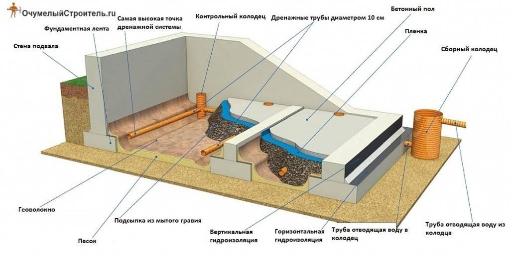 - дренажную систему под фундаментом, вокруг подвала или всего дома, которая собирает большую часть влаги и выводит её за пределы внутренней зоны.