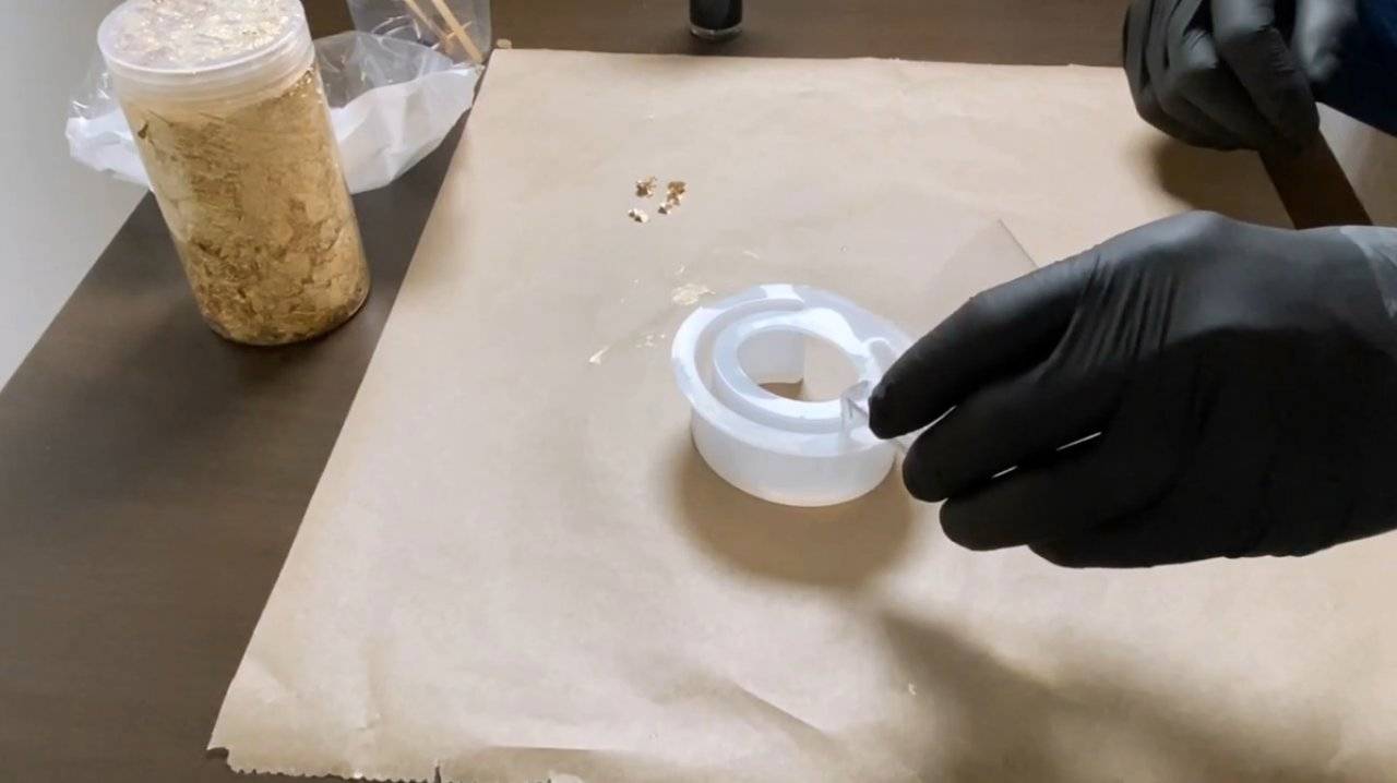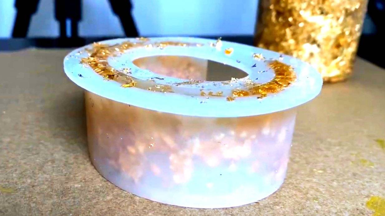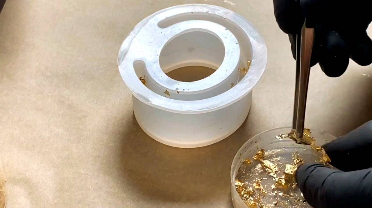 Аккуратно укладываем хлопья сусального золота или другого наполнителя в молд при помощи пинцета. Заливаем еще треть состава, кладем еще золота и заливаем молд смолой до верха.