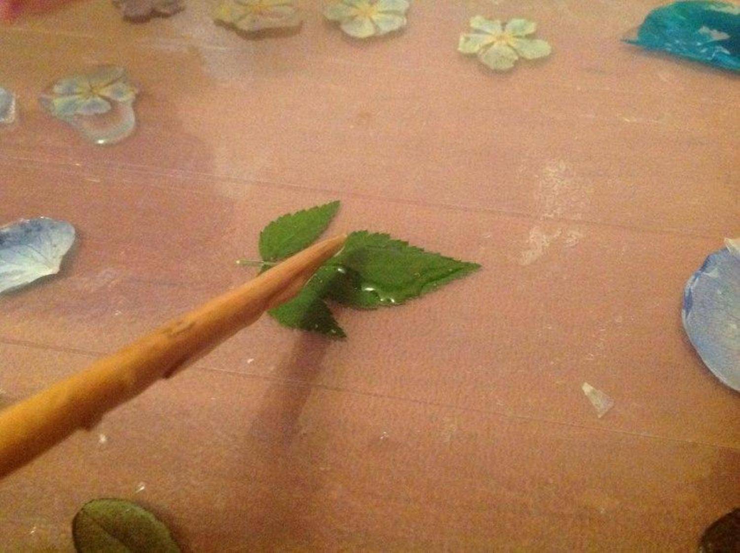 Кладем на подготовленную поверхность наш листок и аккуратно покрываем его тонким слоем эпоксидки.