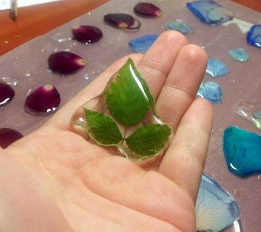 Изготовление этого украшения из эпоксидной смолы не требует даже использования молда: состав заливается непосредственно на листок (или лепесток цветка) – это уж по желанию.