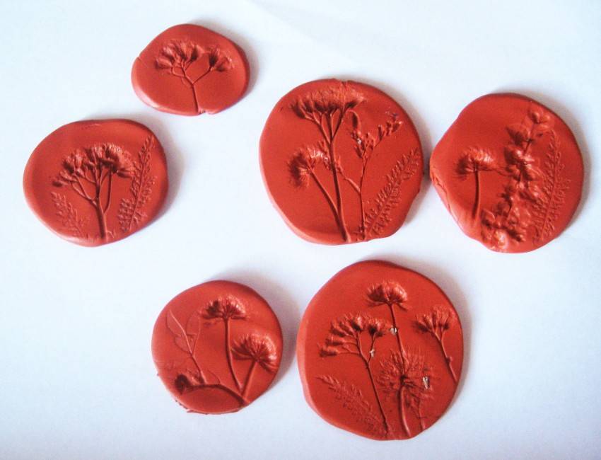 Когда негативы «пропеклись» и остыли, смачиваем их водой с той стороны, где отпечатались прожилки. Кладем их на второй раскатанный кусочек глины. Повторяем операцию с прижиманием пальцами и скалкой.