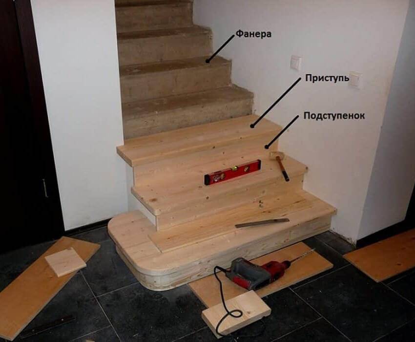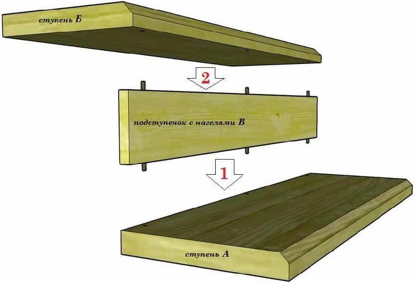 В отмеченных местах проделывают отверстия и заполняют их эпоксидной смолой. В заключение крепят подступенок. После этого на фанеру с клеем кладут проступь с прикрепленным к ней очередным подступенком. Чтобы изделие лучше приклеилось, рекомендуется использовать груз.