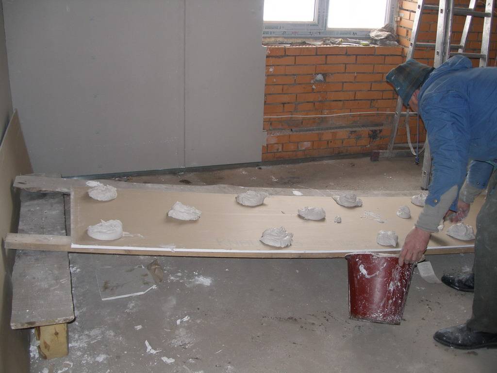 - Нанеся клей на гипсокартон, лист устанавливают на подготовленные для него на полу подставки из фанеры или старой керамической плитки, толщиной в 8÷10 мм.