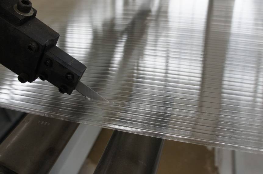 Учитывая правильность расположения панелей относительно их рёбер жёсткости, стоит подготовить чертеж с замерами нужного количества поликарбонатных пластин. После чего нужно приступать к резке большого полотна.