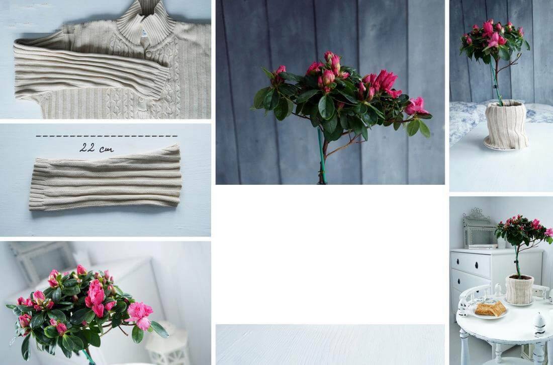 Рукава свитера достаточно, чтобы сделать теплое покрытие горшка. Это решение очень сильно обогревает интерьер, привнося уют.