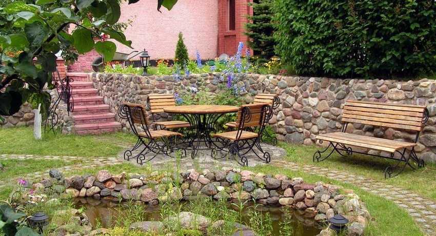 - каменные элементы – смотрятся богато и фундаментально. Вместо дорогостоящего натурального камня можно использовать остатки облицовочного кирпича, выложенного мозаикой;