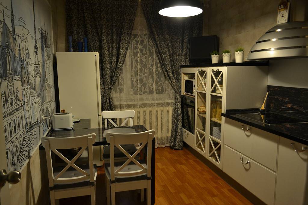 Самый практичный вариант для маленькой по площади кухни. В одном углу располагается сам кухонный гарнитур и рабочая зона, во втором углу — обеденная группа. Единственное, над чем придется подумать — размеры обеденного стола. Владельцам тесных кухонь придется довольствоваться маленьким или узким столом, а вот в просторных помещениях отлично расположится стандартный обеденный стол на несколько человек.