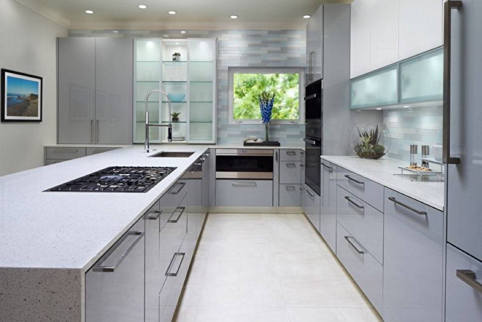 Также не обходятся в современных кухнях без использования стекла и акрила. Именно за счёт этих материалов мебель выглядит нарядной и представительной. Покрытие из акрила скрывает основу из МДФ или ДСП, позволяя оформить гарнитуры в самых разнообразных оттенках. Стеклом декорируют дверцы шкафов и столешницы. С такими элементами кухни кажутся легче.