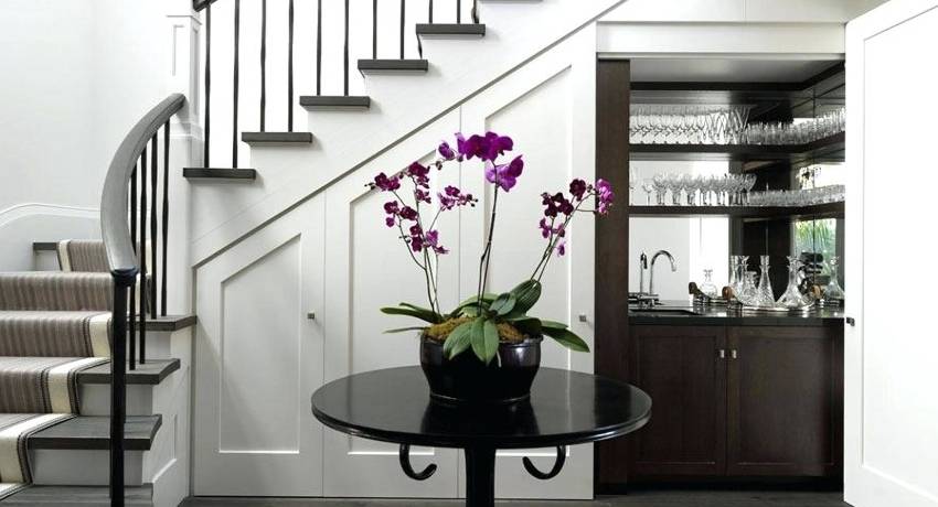 Винный бар, имеющий форму полки с отделениями и полками для бутылок, отлично впишется под лестницу, расположенную в столовой или гостиной. Для кухонного пространства можно оборудовать в этой зоне гарнитур, а в коридоре занять место под ступенями с помощью вешалки, обувных полок или небольших стеллажей для хранения вещей, ключей и зонтиков.
