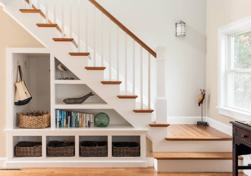Самый распространенный вариант практичной организации места под лестницей — это занять его для хранения вещей. Это могут быть шкафы, кладовки, гардеробные или просто открытые полки.
