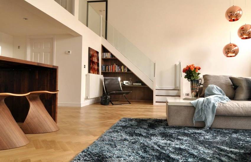 В большой двухуровневой квартире в Лондоне дизайнер тщательно проработал лестничную зону. (смотреть весь проект: Современный пентхаус в мансарде старинного дома – 30 фото). Была спроектирована большая мебельная группа около стены за лестницей. Каждая часть этого большого шкафа выполняет отдельную функцию: под ступеньками – место для отдыха, над ступеньками – открытые полки, закрытые шкафчики и ниши для декоративных статуэток.