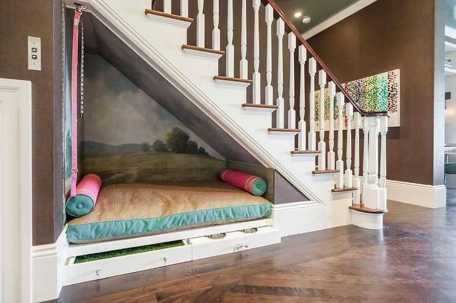 Кровать под лестничным маршем или уютный диванчик являются частым обустройством такого места.