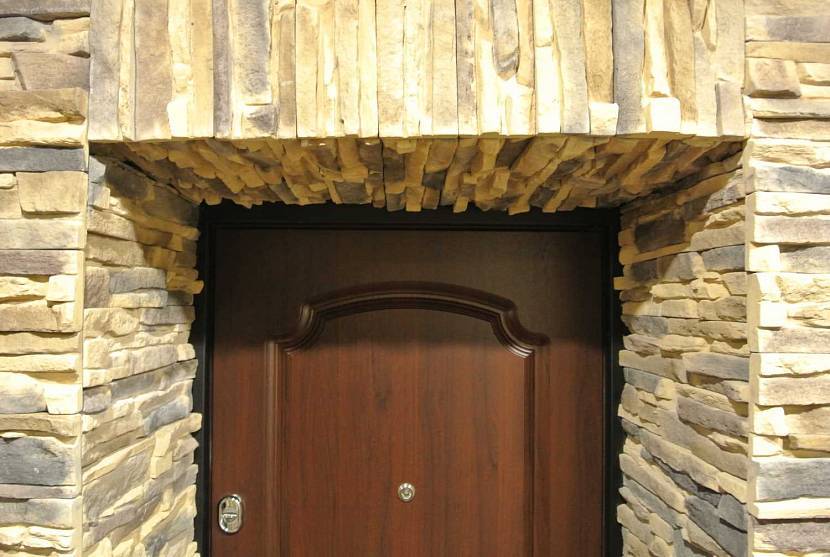 - Искусственный камень выпускается в тонких панелях, которые фиксируют к внешней части двери с помощью строительной смолы. Конструкция, обложенная камнем, смотрится весьма эффектно.