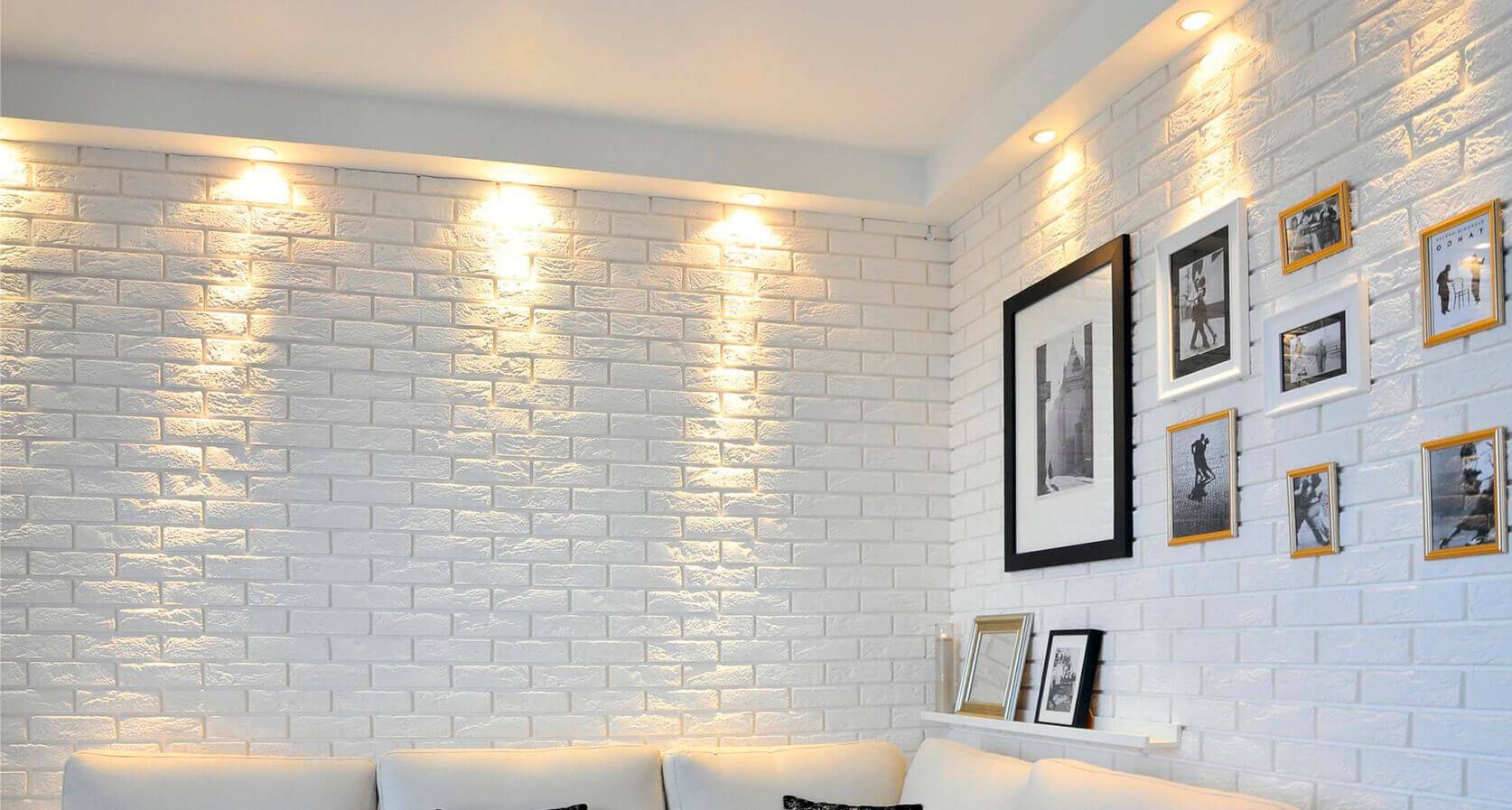 Имитация белой кирпичной стены с классическим интерьером, на фото ниже.