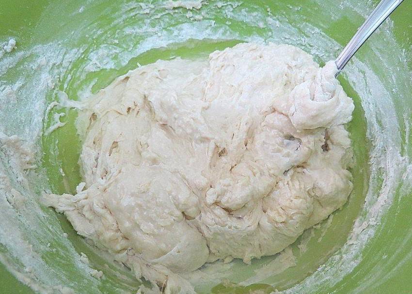 - Муку добавляем понемногу, вымешиваем ложкой, не руками так, чтобы тесто не получилось слишком густым.