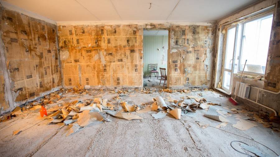 Прежде всего со стен снимают старые обои, краску и штукатурку