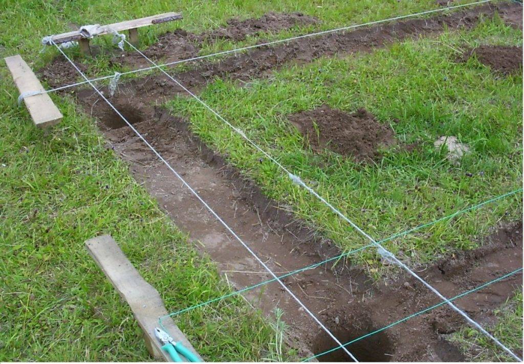 Далее по отмеченному периметру роется котлован, который составляет в ширину 30–50 сантиметров, а глубина рассчитывается, исходя из нагрузки и уровня промерзания почвы, поэтому этот показатель может составлять от 0,7 до 1,7 метра.