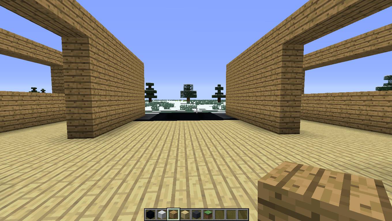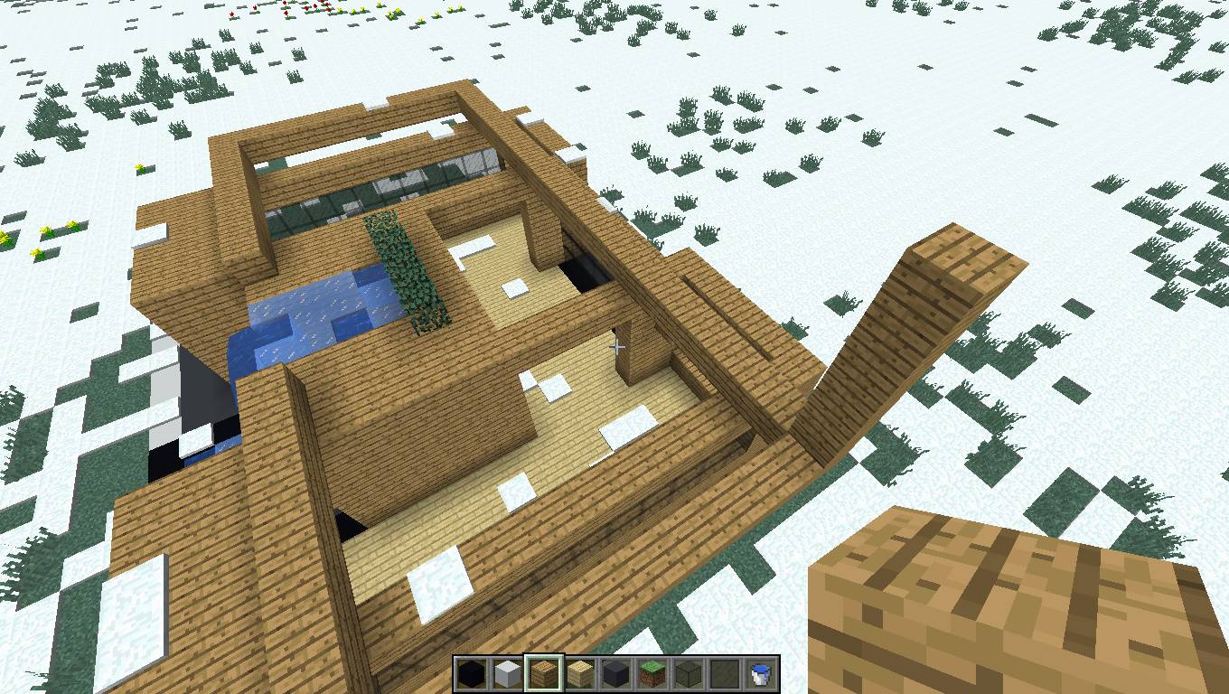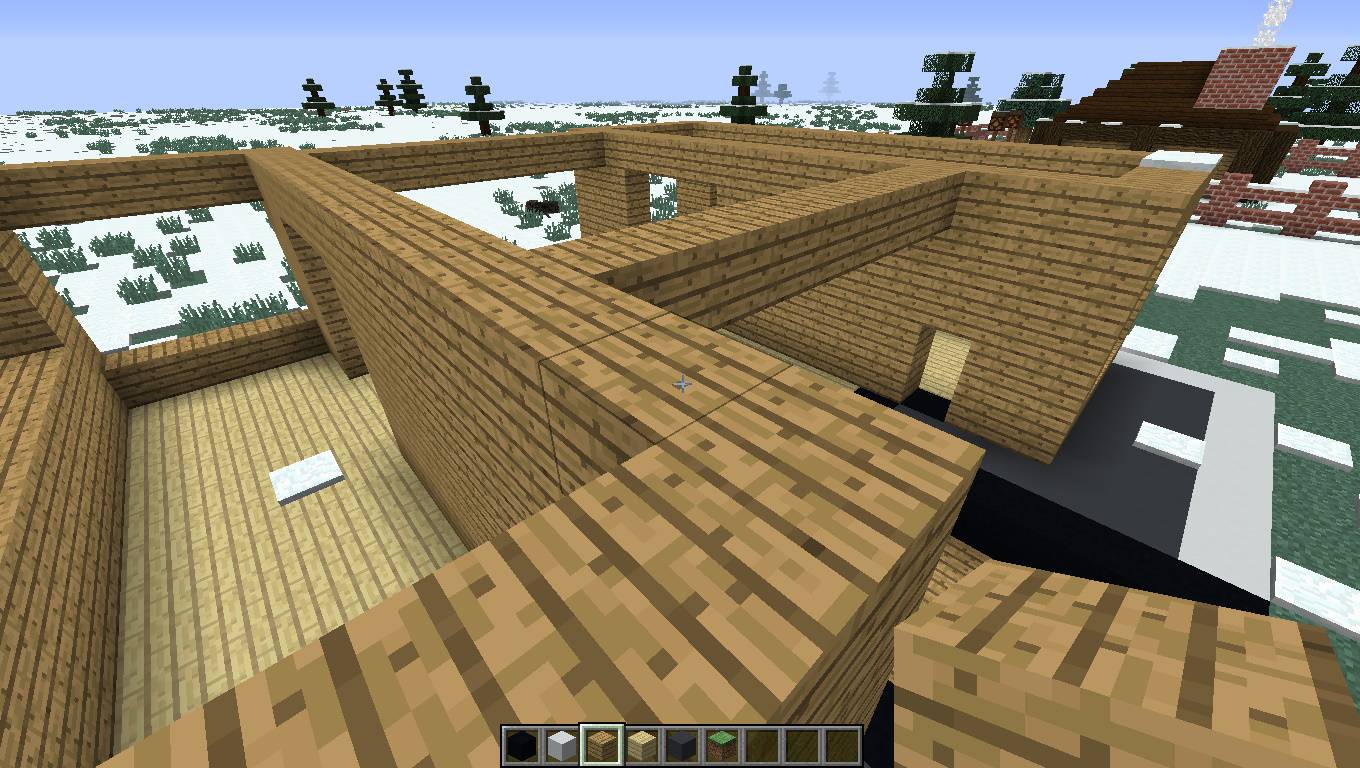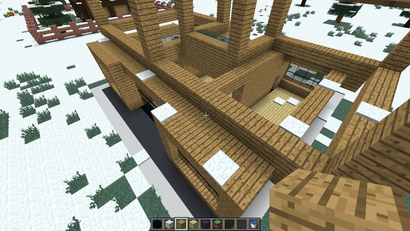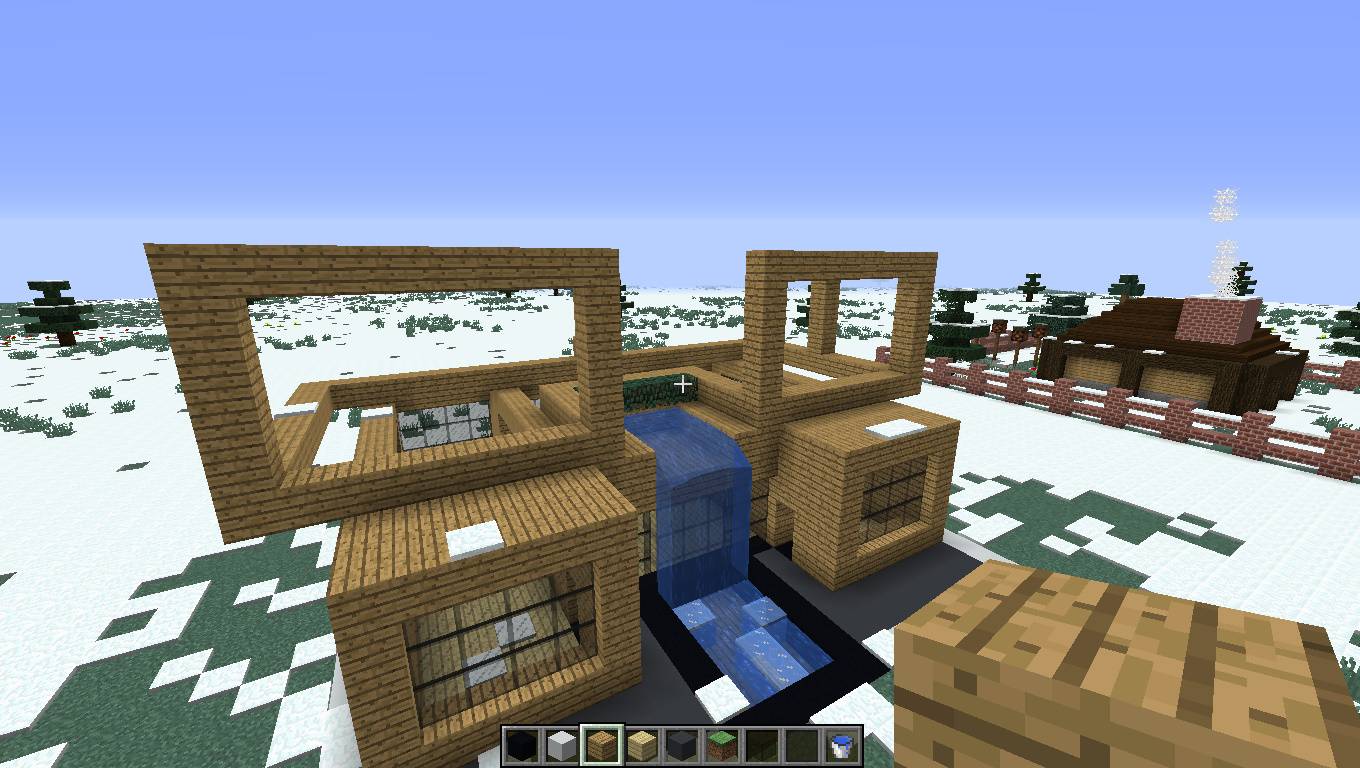 - Не стройте простые коробки. Сделайте угловой дом или другой нестандартной формы. Для этого соедините несколько коробочек в одну конструкцию и начните ее улучшать. Можно сделать колонны из дуба или любого другого дерева, а сами деревянные блоки оставить на заднем плане. В общем, начните творить;