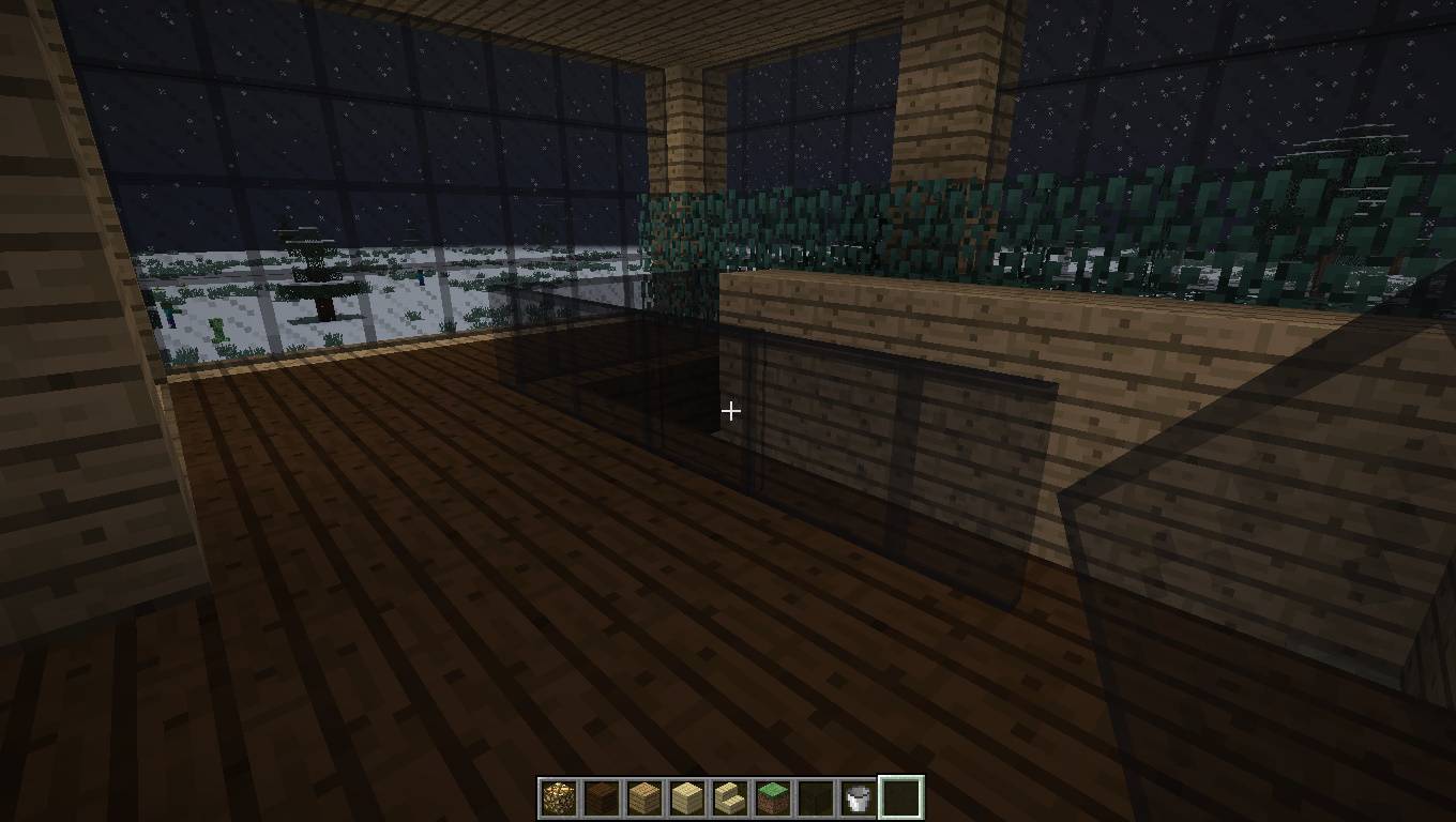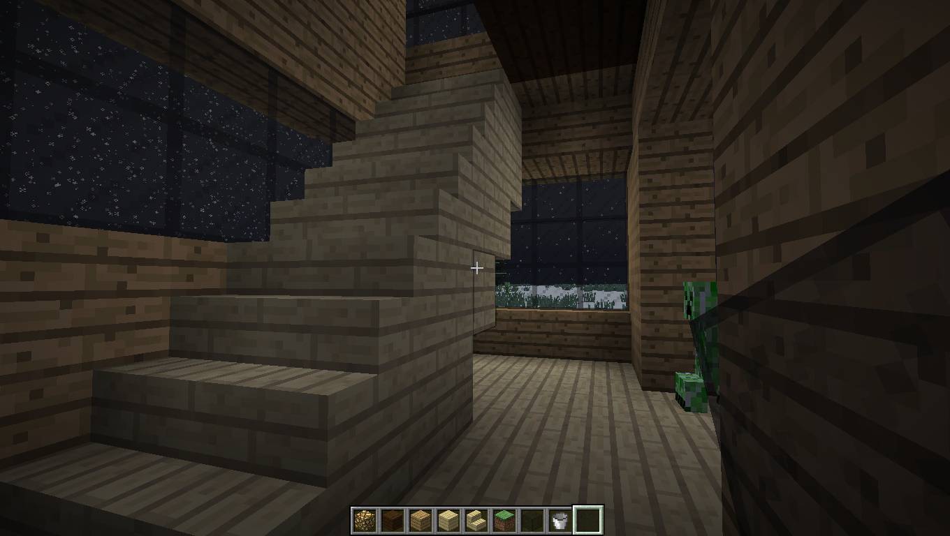 - Далее в конце комнаты (справа относительно фронтальной стороны) во всю ширину сделайте «живую изгородь» из листьев дуба, высотой два блока. Потом сделайте линию из 6 дубовых досок. Внизу сделайте лестницу шириной два блока. После этого сделайте перила из стеклянных панелей так, чтобы в конце оставался проем в один блок.