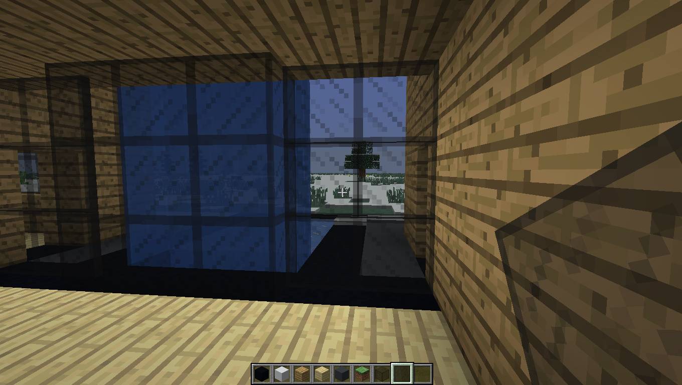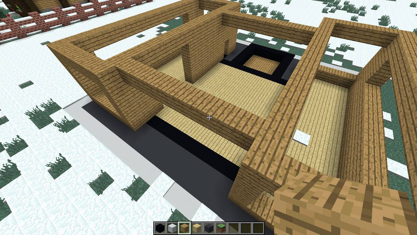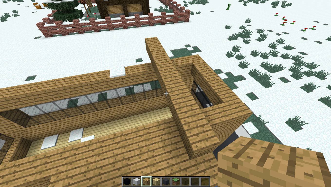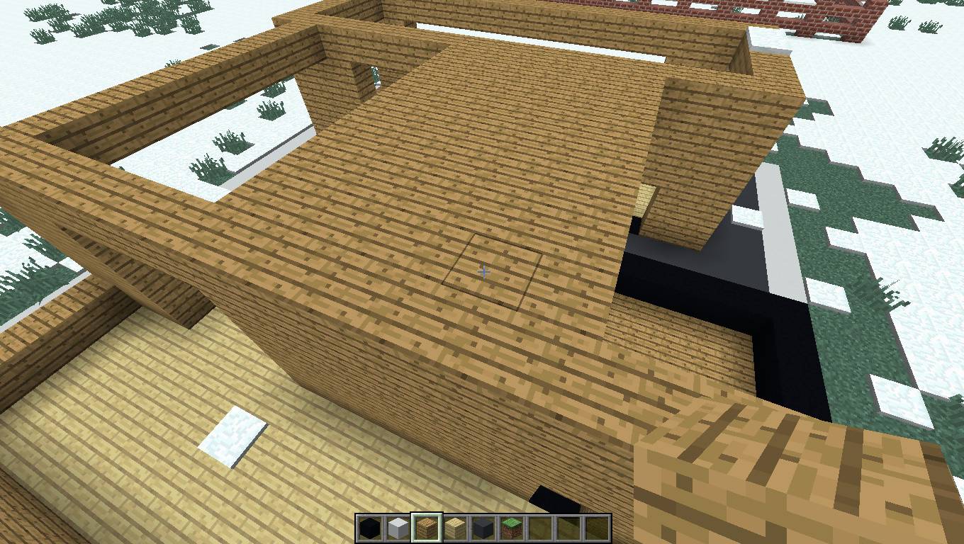 - Потом сделайте окна размером 6 блоков в длину и 5 блоков в высоту. После этого соедините их так же, как на скриншоте. Также по бокам нарастите блоки. Со стороны, где бассейн, нарастите на два блока, а с противоположной стороны на один.