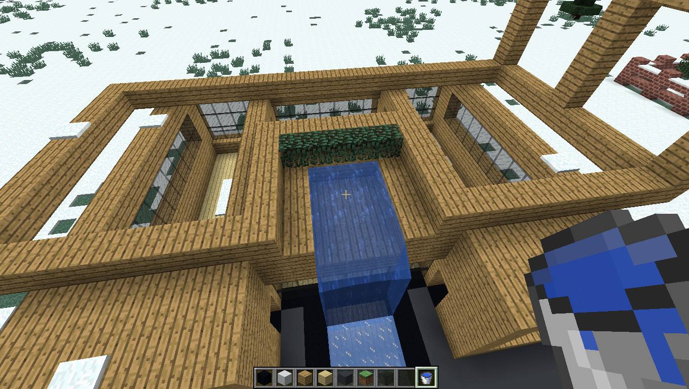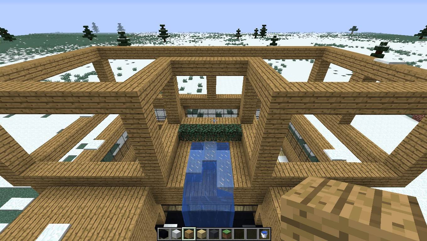 - Потом сделайте на верху, около водопада, линию из дубовых досок длиной 9 блоков, так, чтобы два заходили дальше стены. Потом сделайте такую конструкцию. Колонны делайте высотой пять блоков (не считая линию конструкции).