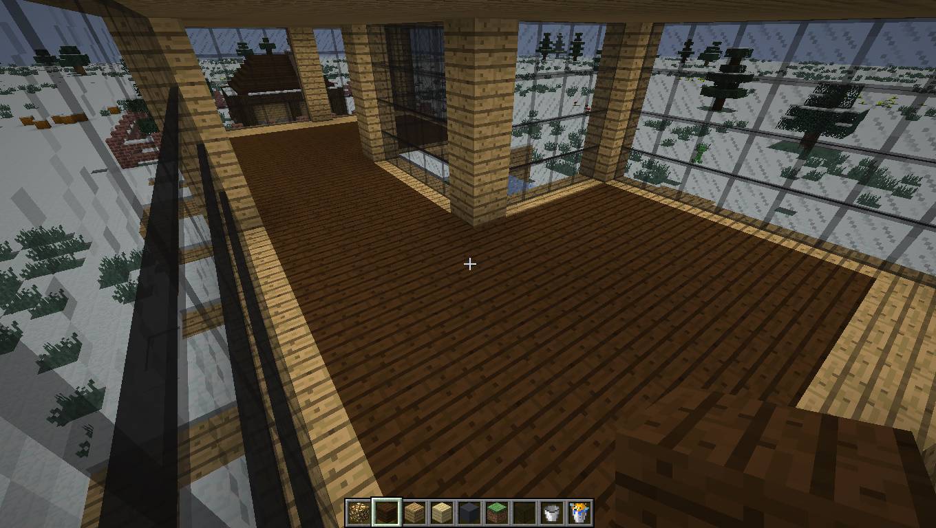 - По всему периметру заделываете оконные проемы стеклянными панелями. На верху делаете крышу (новый слой делать не надо, просто начните делать крышу, на конце верхней линии окон).