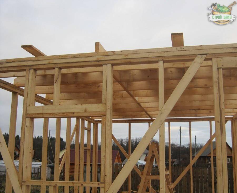 Обычно для балок перекрытия и стропил в каркасных банях используют доски с сечением 15х5 сантиметров. Их помещают на ребро и скрепляют между собой. В результате между стропилами получается расстояние размером 10х12 сантиметров. В вертикальном положении их фиксируют «косынками», а сверху объединяют коньковым брусом аналогичного сечения.