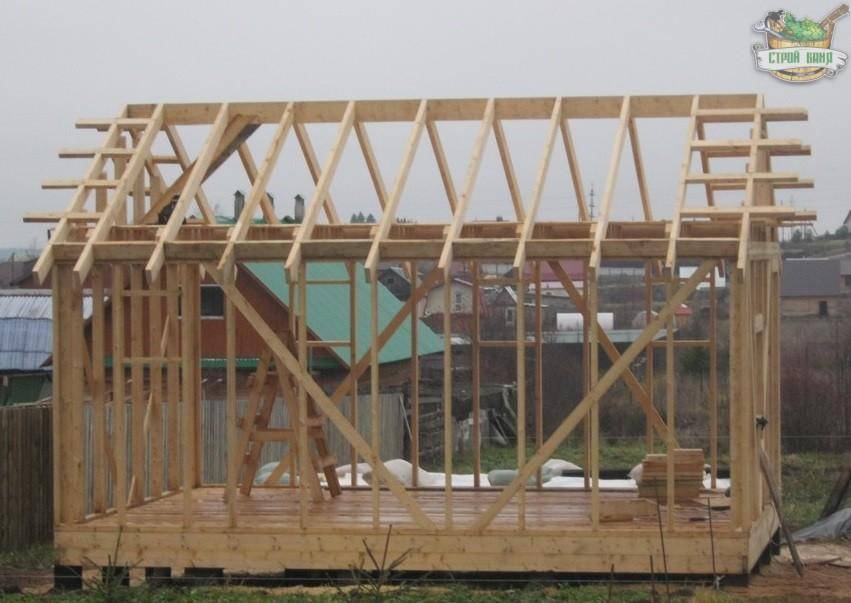 Согласитесь, ведь проще собирать стропильную конструкцию прямо на земле, после чего поднимая ее наверх и уже устанавливая готовой. Тем более, когда речь идет о каркасной бане.