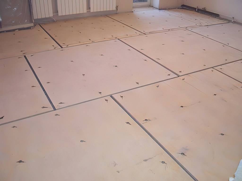 При укладке любого листового материала для выравнивания пола под линолеум, его кладут с разбежкой швов — чтобы они не совпадали (как кирпичная кладка). Между листами оставляют небольшие швы, которые заполняют затем эластичной (нетвердеющей) мастикой.