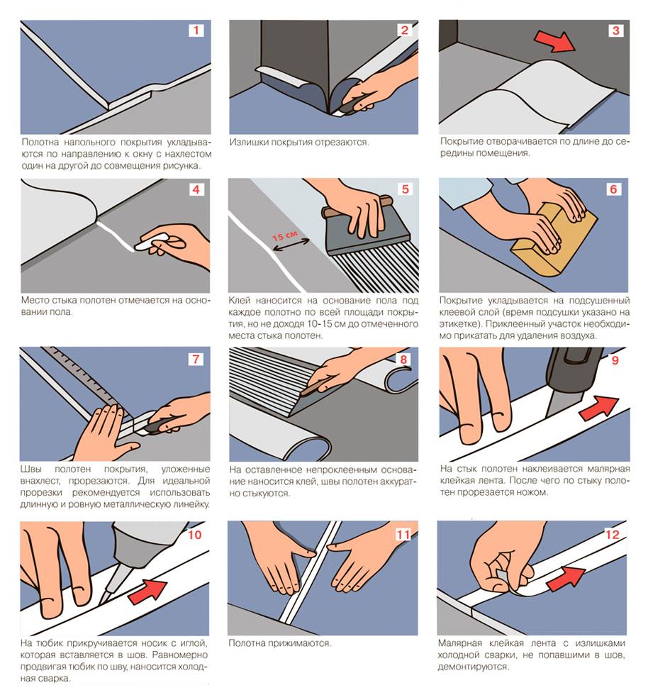 Если этого не сделать, линолеум будет плохо держаться. При укладке нескольких кусков лучше начинать с дальнего, при этом старайтесь подгонять их как можно плотнее. Если придерживаться данной технологии, клея для сварки швов потребуется не так уж и много (а он имеет очень высокую стоимость). Стоит отметить, что через некоторое время шов становится прозрачным, а значит, более эстетичным.